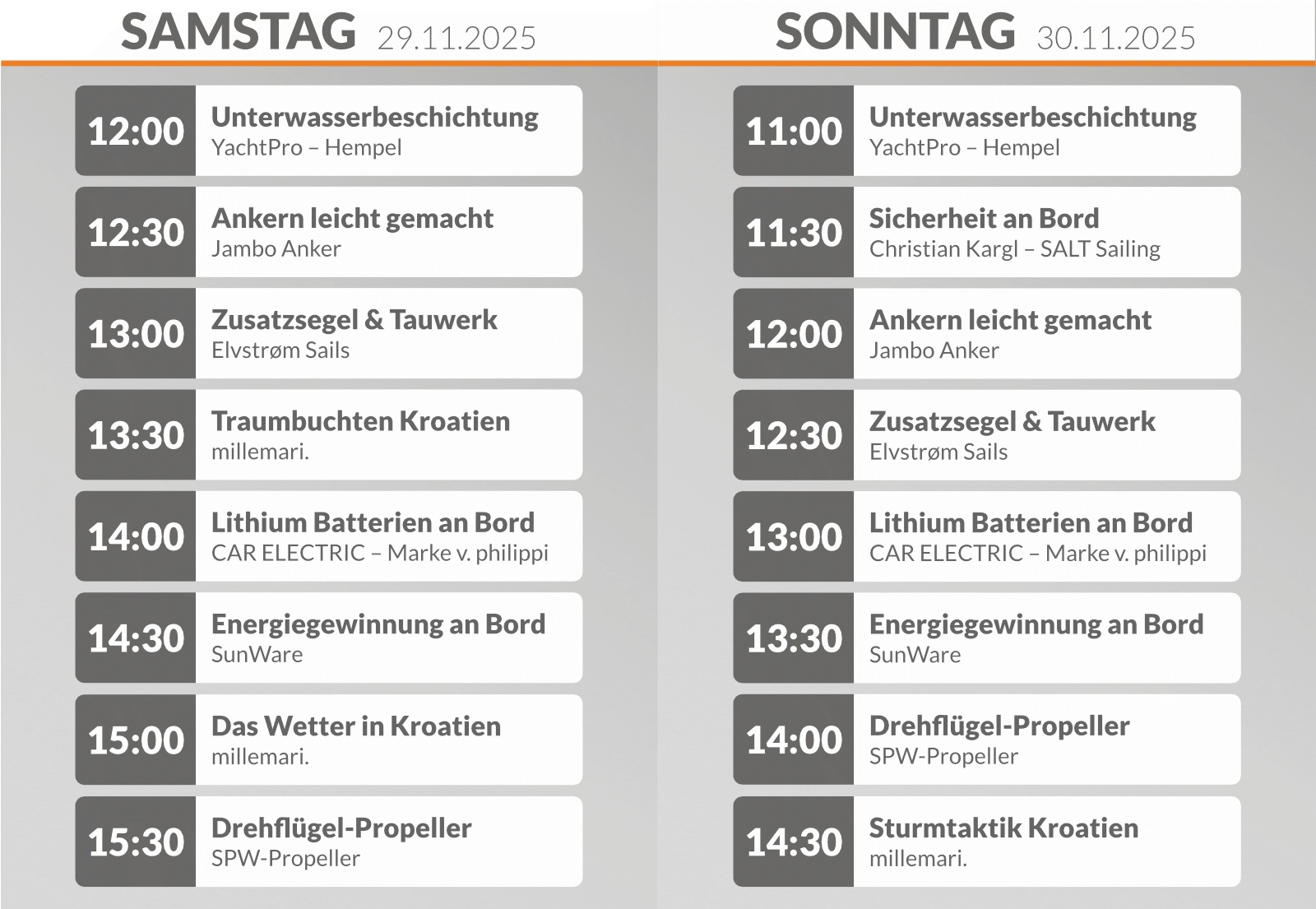 Ein abwechslungsreiches Vortragsprogramm mit spannenden Impulsen zu aktuellen Themen aus der Welt des Wassersports und Techniktrends  – ideal für Einsteiger und erfahrene Skipper gleichermaßen.