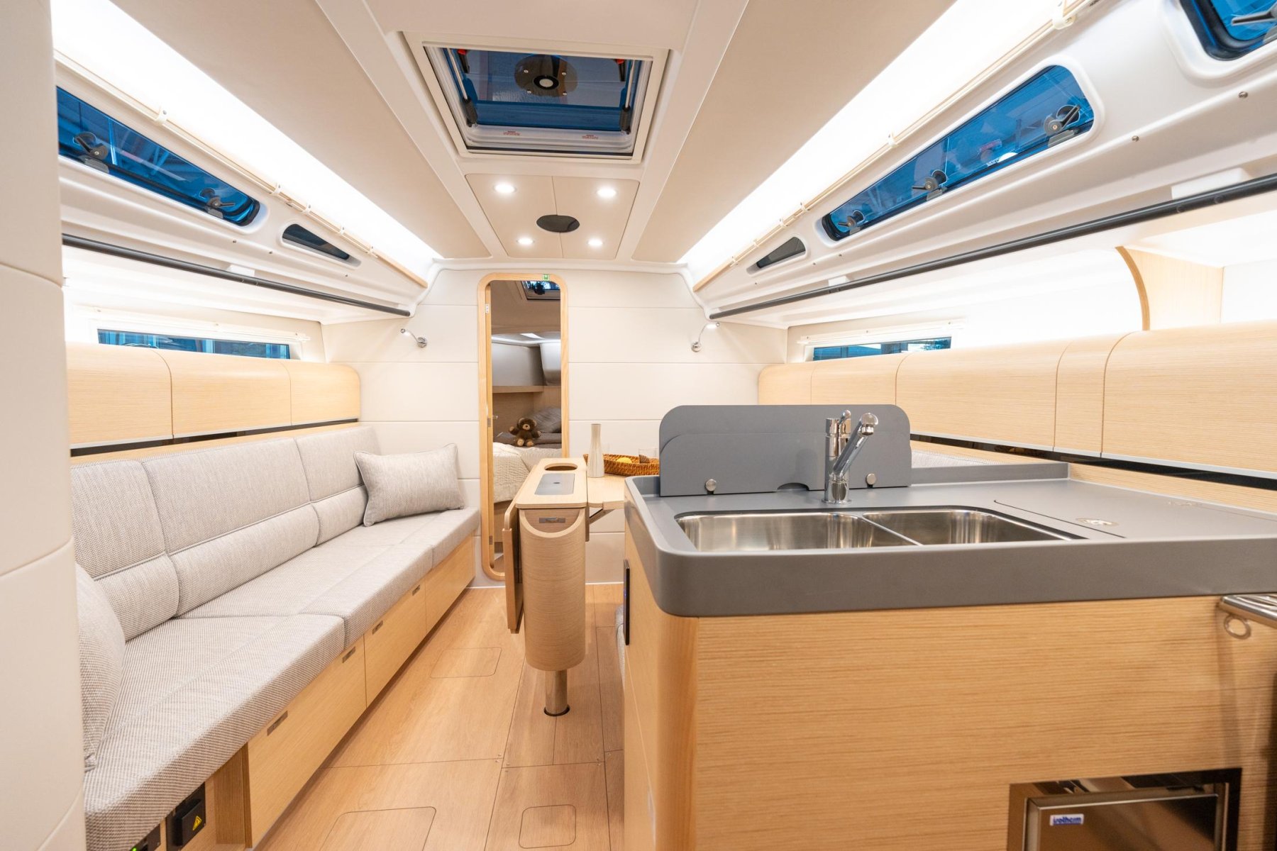 - Komfortpaket: Fußbodenbeleuchtung im Cockpit / am Niedergang, Exterieur Licht Signatur, 2 Lüfter für Aufbauluken, Fußbodenbeleuchtung im Salon, indirekte Beleuchtung in Salon und Kabinen, LED Deckenbeleuchtung im Salon und Eignerkabine dimmbar, SLS - Scenario Licht System - Touch Screen Controller und Dimmer im Salon und Vorschiffskabine, Cockpitpolster light grey, Rolloset mit Fliegengitter für Decksluken, Rollos für Rumpffenster, Faltplissees für seitliche Kajütdachfenster