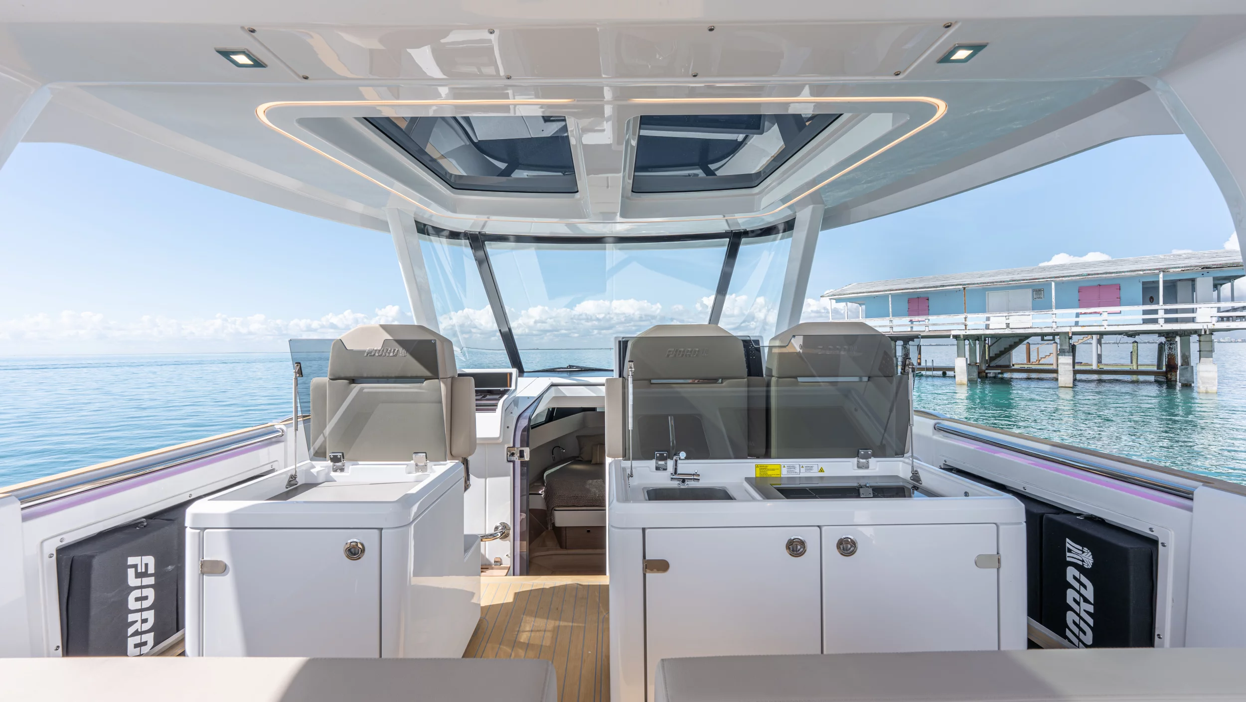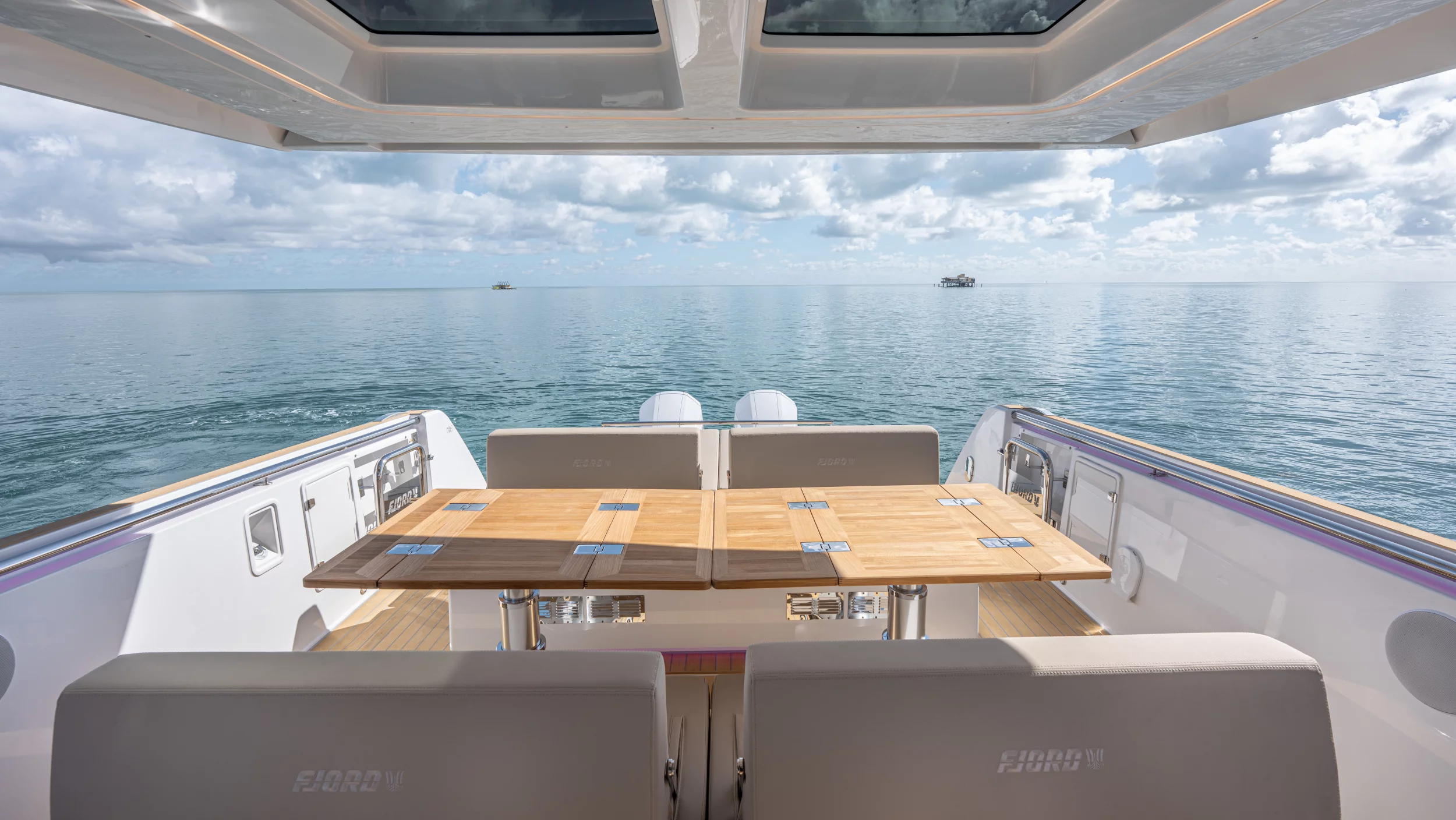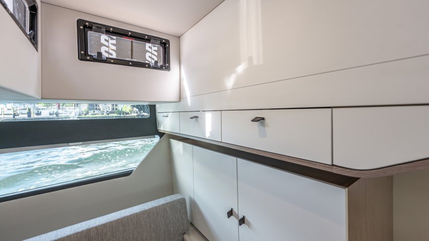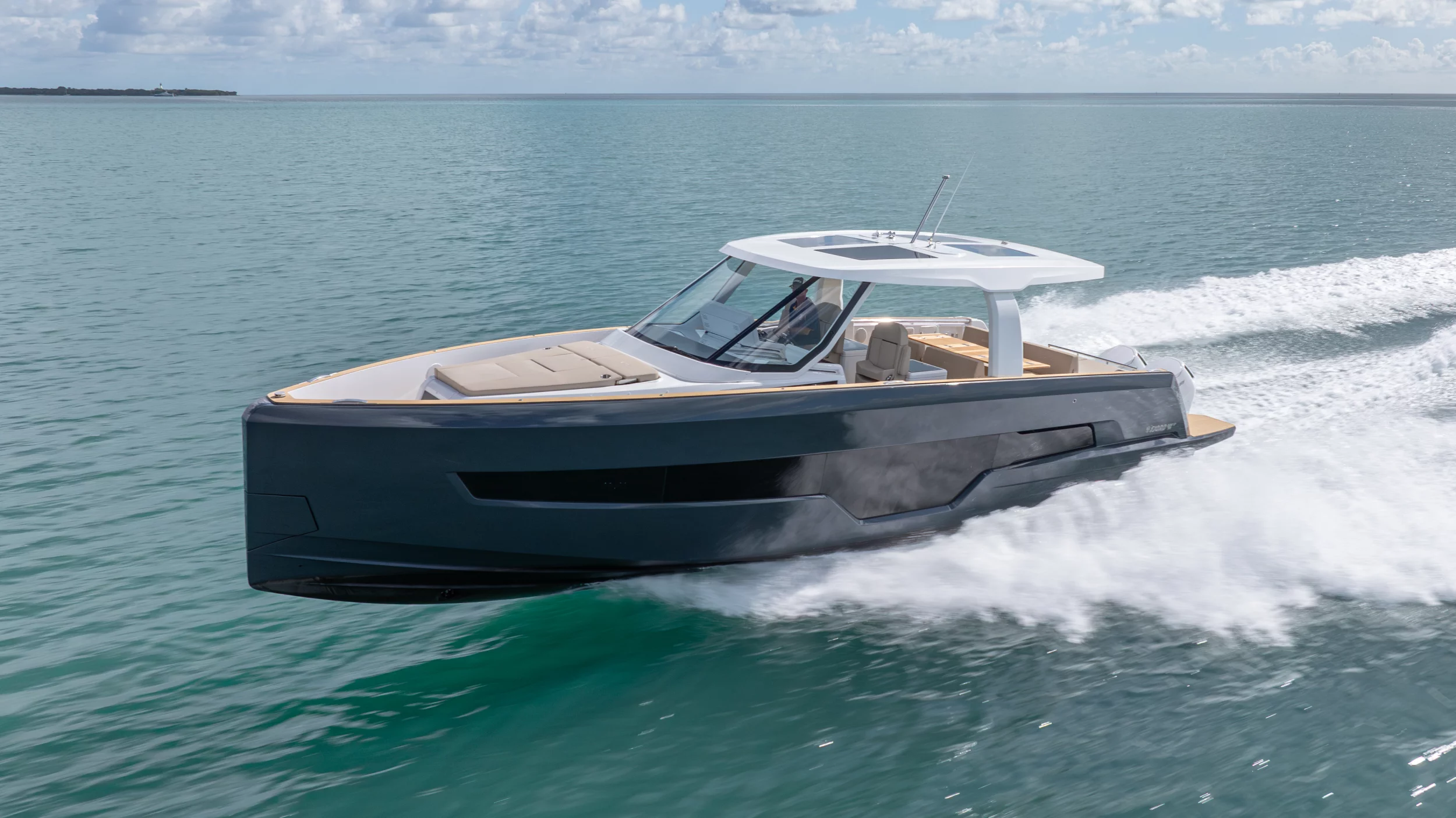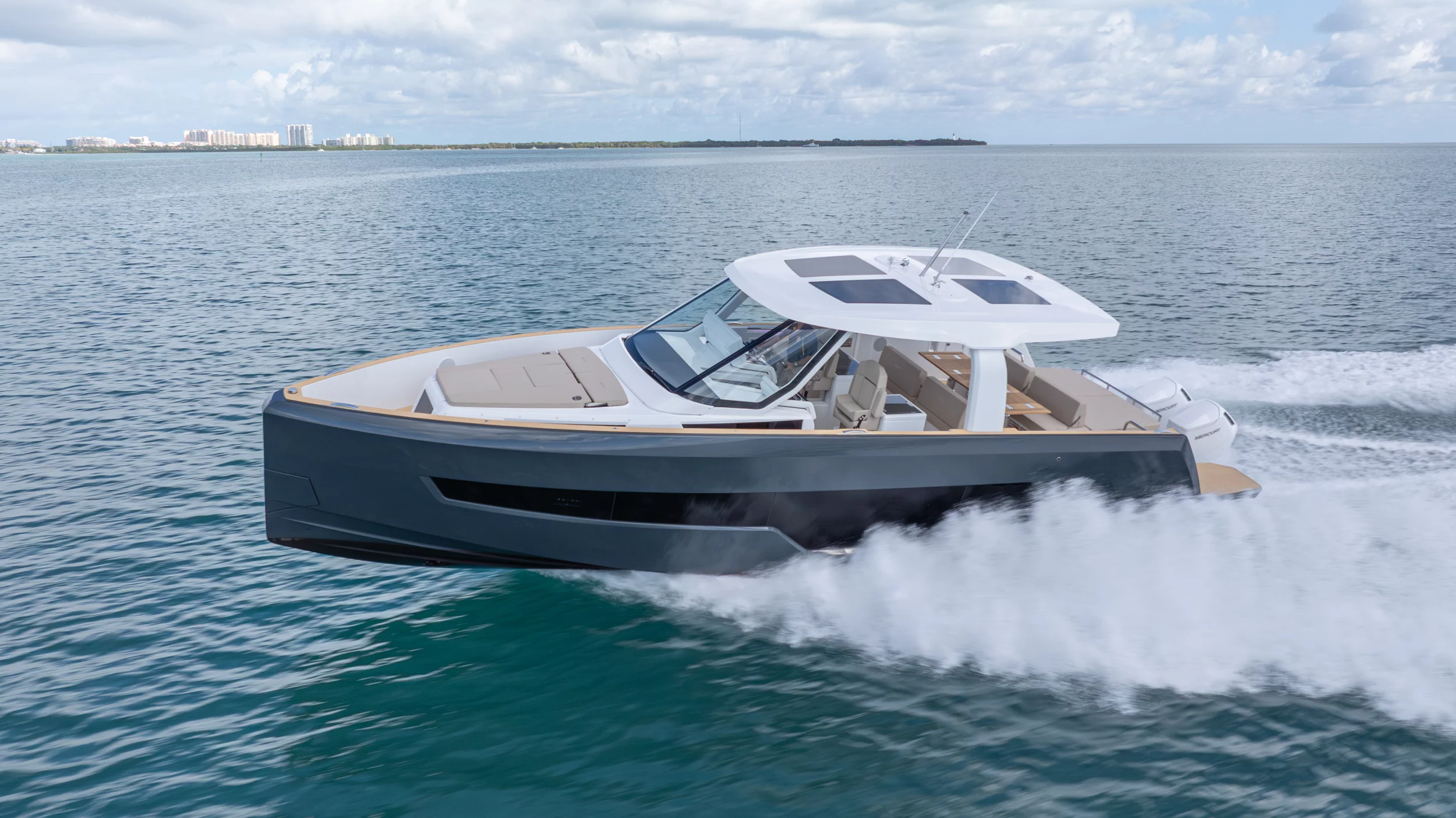 Ihre einzigartige Kombination aus Leistung, Komfort und ikonischem Design aus der Feder des renommierten Yachtdesigners Patrick Banfield macht die neue FJORD 41 XP zum absoluten Highlight auf dem Wasser. Die zwei 600 PS starken V12-Mercury-Verado-Außenbordmotoren der Yacht sorgen für eine atemberaubende Beschleunigung und beeindruckende Geschwindigkeiten von über 40 Knoten. Moderne Navigationsgeräte und eine intelligente Lenkung machen das Manövrieren einfach und intuitiv. Selbst bei voller Fahrt schützten das charakteristische T-Top und verschiedene Windschutzscheiben-Optionen vor den Elementen. Neben der imposanten Power bietet die Yacht ein unvergleichliches Raumangebot und maximale Bewegungsfreiheit an Deck. Das geräumige Cockpit mit seiner bequemen Lounge und zwei großzügigen Tischen schafft den perfekten Rahmen für einen gemütlichen Sundowner oder eine glamouröse Cocktailparty unter der Sonne. Die großen Rumpffenster sorgen nicht nur für einen modernen Look, sondern fluten das Innere der Yacht mit viel natürlichem Licht. Das Interior der 41-Fuß-Yacht beeindruckt zudem mit einer Auswahl von 20 Layoutvarianten. So können Sie Ihren ganz persönlichen Stil verwirklichen. Erleben Sie den Reiz der Geschwindigkeit und ein Höchstmaß an Individualität auf der brandneuen FJORD 41 XP!