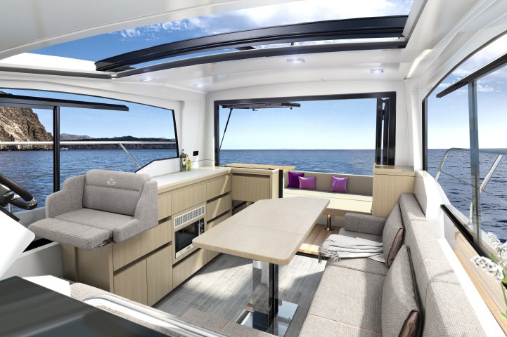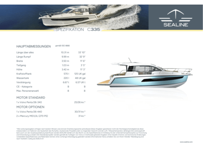 An Bord der SEALINE C335 folgt ein großartiger Augenblick auf den anderen. Dazu gehören intensive, sportliche Fahrerlebnisse: erzeugt von 440 PS Motorkraft, der neu gestylten, klar aufgebauten Instrumententafel – und der grandiosen Rundumsicht am Steuerstand. Sogar in der Eignerkabine genießen Sie Licht von allen Seiten. Raffiniert wie nie zuvor erzeugen Premiumstoffe und Edelhölzer hier eine luxuriöse Wohlfühlatmosphäre. Mittelpunkt der SEALINE C335 ist der lichtdurchflutete Salon, der die höchsten Erwartungen an Ästhetik und Großzügigkeit erfüllt. Willkommen an Bord!
