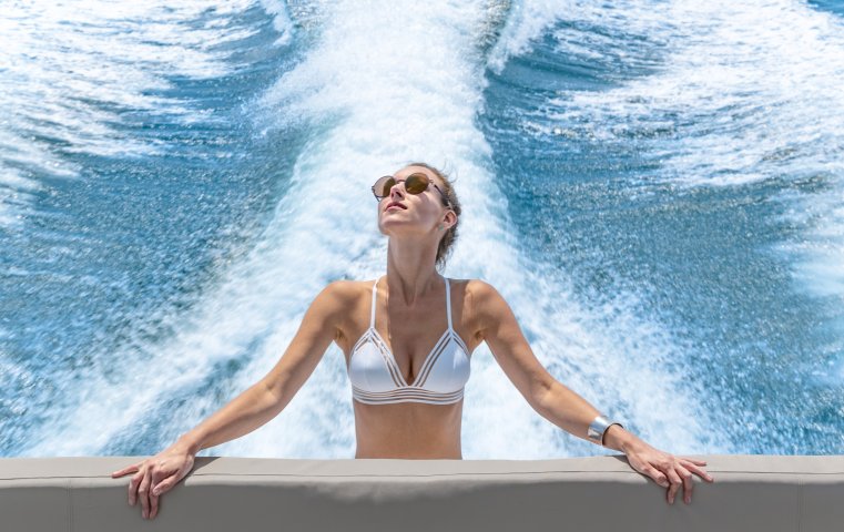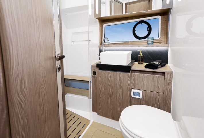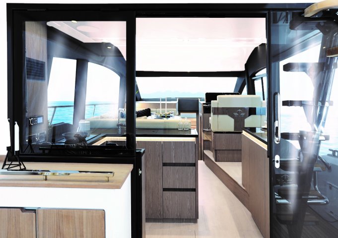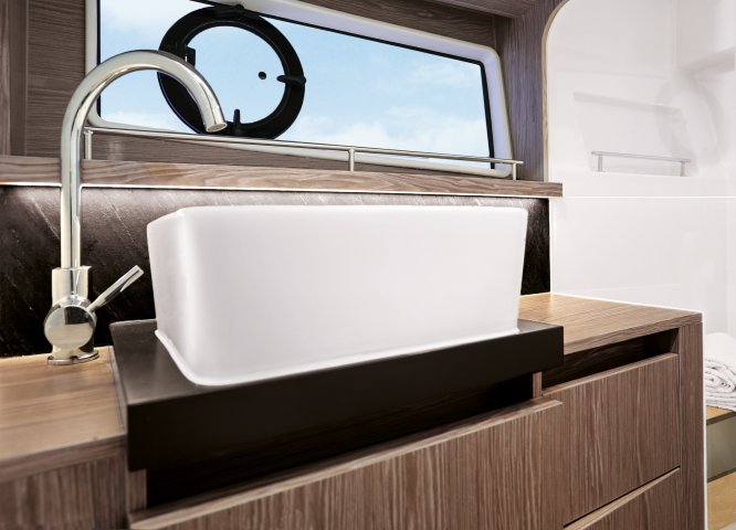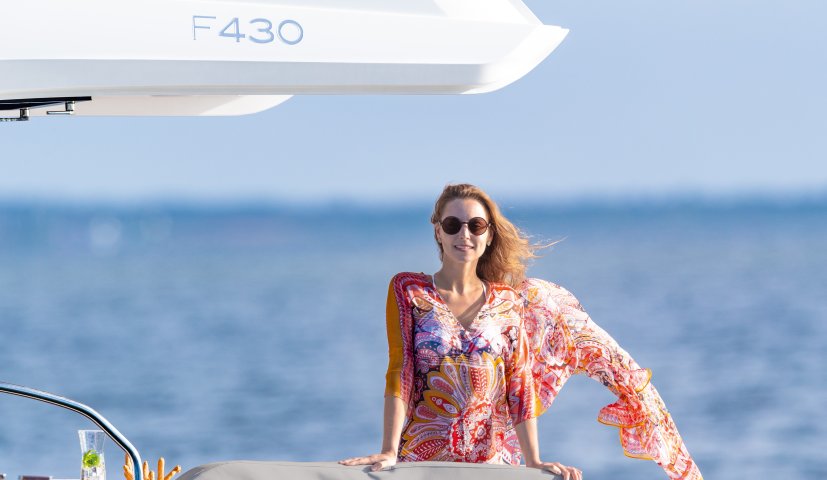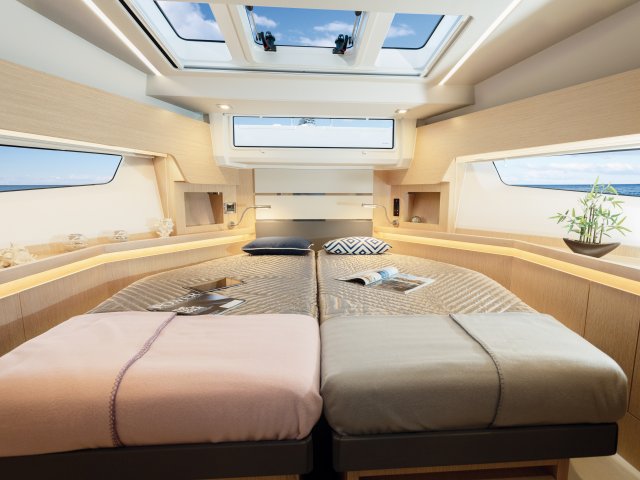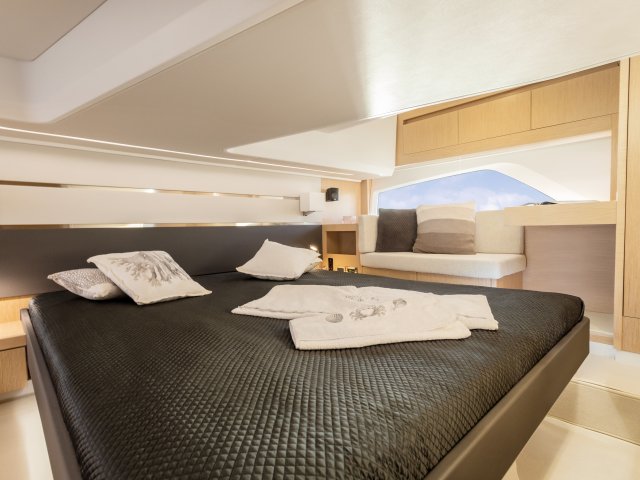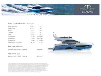 Die SEALINE F430 steckt von der Bugspitze bis zur Badeplattform voller exquisiter Raffinessen – mehr luxuriöser Lifestyle auf 43 Fuß geht nicht. Für das Leben unter freiem Himmel bietet das Exterieur allein schon drei Optionen. Wählen Sie das Cockpit, die Buglounge oder das Highlight: die Flybridge. Mit 14m2 Fläche hält diese souverän den Klassenrekord. Außengrill mit Wetbar und zwei Kühlschränke befinden sich stets in Reichweite. Im Cockpitbereich kann ebenfalls eine Outdoorpantry installiert werden. Die unverwechselbaren Rumpffenster prägen optisch das Exterieur und erhellen das Interieur mit natürlichem Licht. Hier finden drei vollwertige Doppelkabinen Platz – oder zwei Kabinen mit einer Masterkabine mittschiffs. Feine Lederpaneele, Wandelemente aus echtem Schiefer und mit Klavierlack veredeltes Mobiliar unterstreichen auch visuell den Anspruch an vollkommenen Luxus.