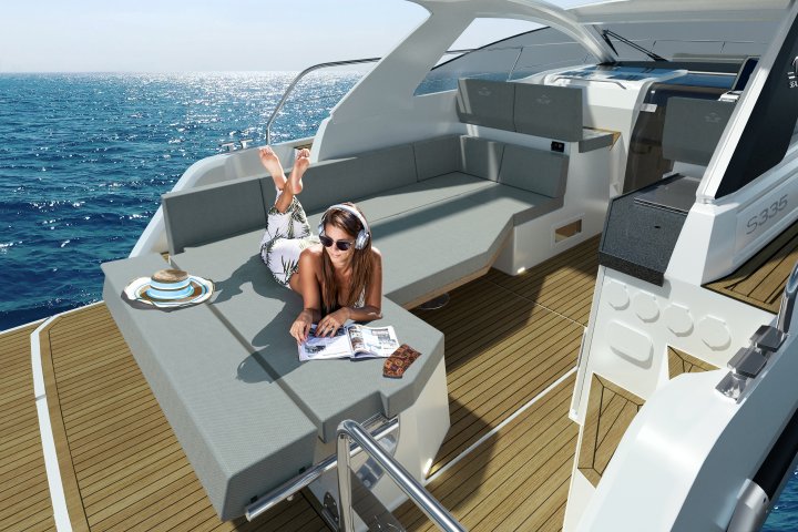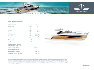 Wenn die Power von 400 PS und die Kraft der Sonne ein euphorisches Lebensgefühl erzeugen, dann sind Sie an Bord der SEALINE S335. Fesselnde Fahrerlebnisse, sportliche Ästhetik und ein verblüffendes Platzangebot bringen das Konzept der S-Serie auf den Punkt. Auf der Bug-Sonneninsel entspannt die gesamte Crew, das Cockpit beherbergt sogar noch weitere Gäste, umgeben von höchstem Komfort. Unter Deck geht das luxuriöse Bordleben unabhängig vom Sonnenschein weiter. Das innovative Interieur-Konzept lässt Ihnen die Wahl zwischen fünf charmanten Layout-Optionen. Beispielsweise kann die Eignerkabine mit U-Sofa und Tisch zum großzügigen Wohnbereich ausgebaut werden. Sämtliche Varianten machen Ihnen das größtmögliche Platzangebot: Stehhöhe, Fensterfläche und Größe der Kojen suchen in dieser Bootsklasse ihresgleichen.